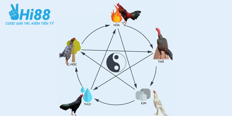Theo nguyên lý ngũ hành, có 5 loại ngũ hành gồm Kim, Mộc, Thủy, Hỏa và Thổ. Mỗi màu lông của gà tương ứng với một ngũ hành khác nhau. Từ lâu, người chơi gà chọi đã yêu thích áp dụng các nguyên tắc này từ các sách thư cổ xưa. Phần tương khắc chủ yếu tập trung vào màu lông của đối thủ, kết hợp với mùa và ngày giờ để đưa ra quyết định chiến lược.